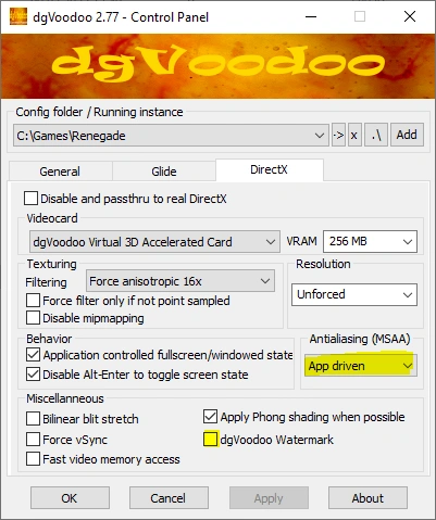Запустите "dgVoodooCpl.exe", затем отключите Watermark и по желанию включите сглаживание.